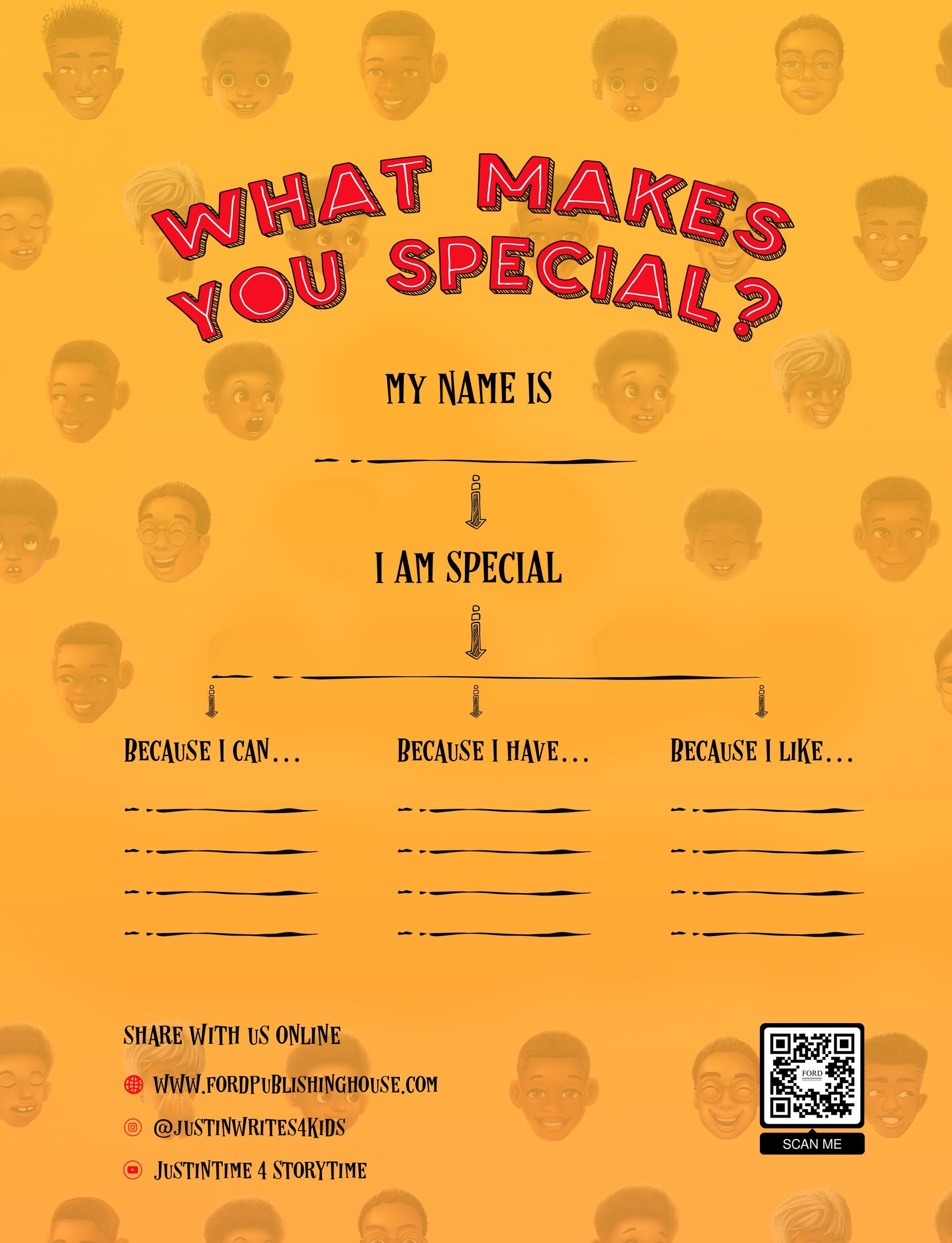 Enjoy a bonus activity from Justin Ford’s inspiring children’s book, I SEE ME— Whether you are FIVE or NINETY-FIVE years young, this FREE activity worksheet is perfect for reminding you exactly what makes you SPECIAL. Perfect for all ages!